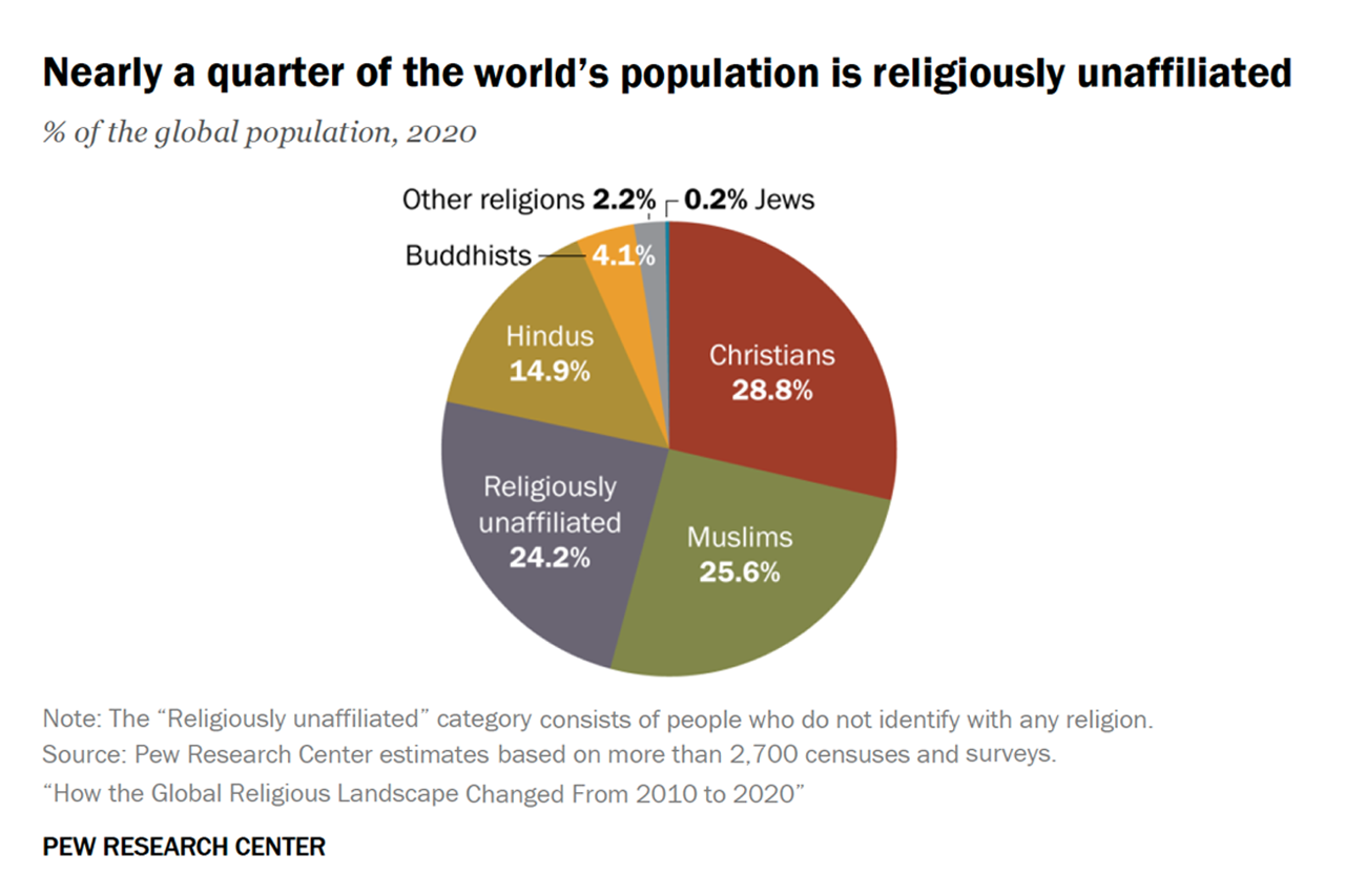 The number of religiously unaffiliated people—those who identify with no particular religion—has also surged. The “nones” are now the third-largest group worldwide, making up 24% of the global population. While they have lower fertility rates and an aging population, their growth is largely fueled by religious switching. The study found that for every one adult raised without religion who later adopts one, about 3.2 people leave their faith of origin, mostly Christianity.